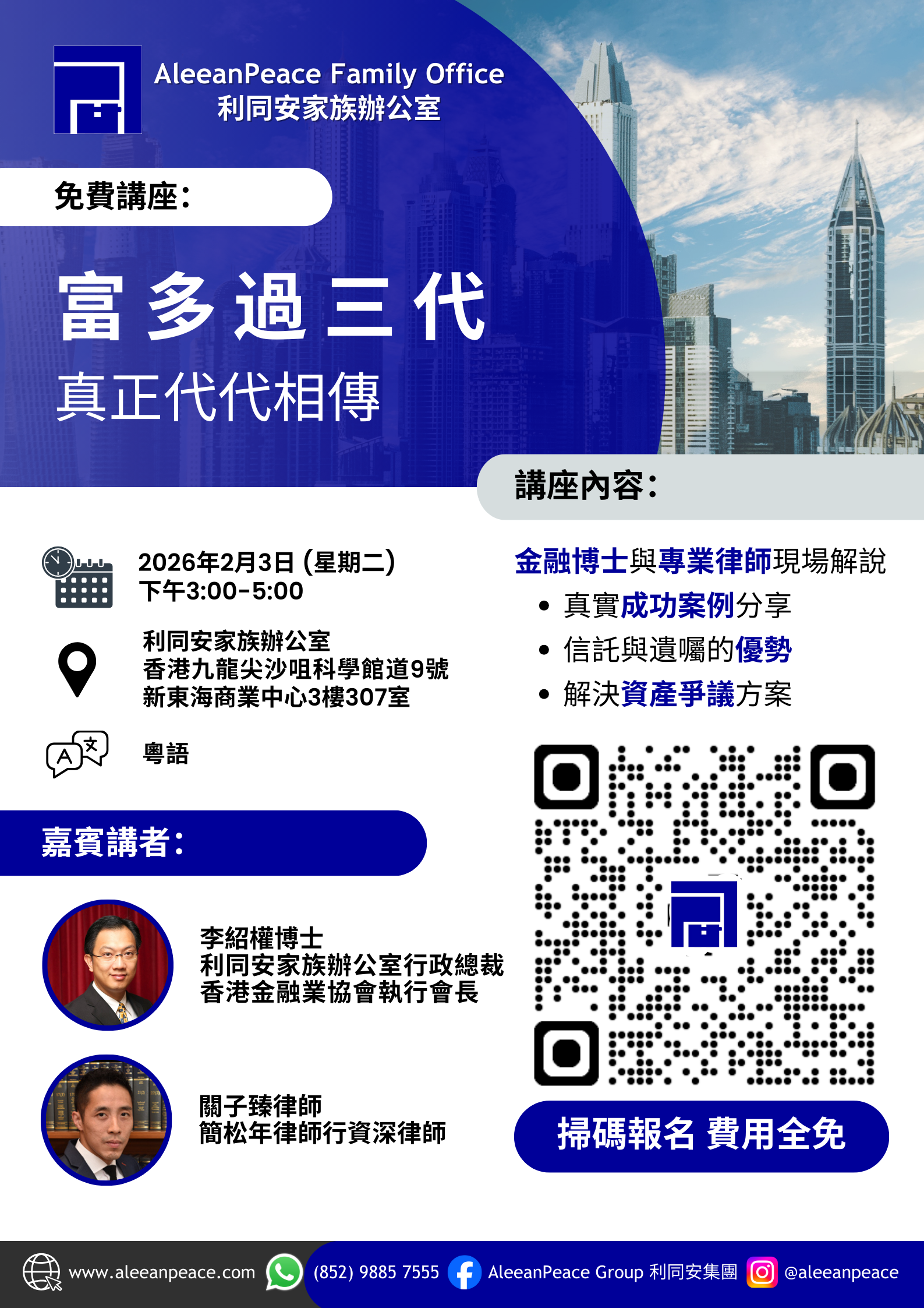 星期二, 3/02 @ 3:00 下午 - 5:00 下午 HKT 《富多過三代 真正代代相傳》 利同安家族辦公室 香港九龍尖沙咀科學館道9號新東海商業中心3樓307室, Hong Kong 嘉賓講者: 李紹權博士 利同安家族辦公室行政總裁 香港金融業協會執行會長 關子臻律師 簡松年律師行資深律師 講 […]